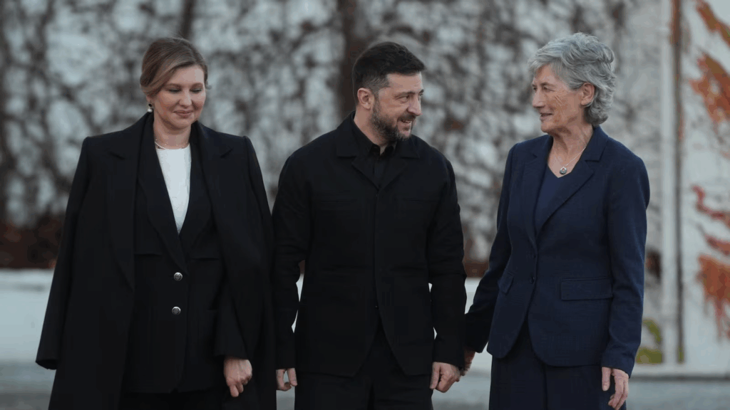 Ukrainian President Volodymyr Zelensky and his wife Olena Zelenska were welcomed by Irish President Catherine Connolly at Aras an Uachtarain.