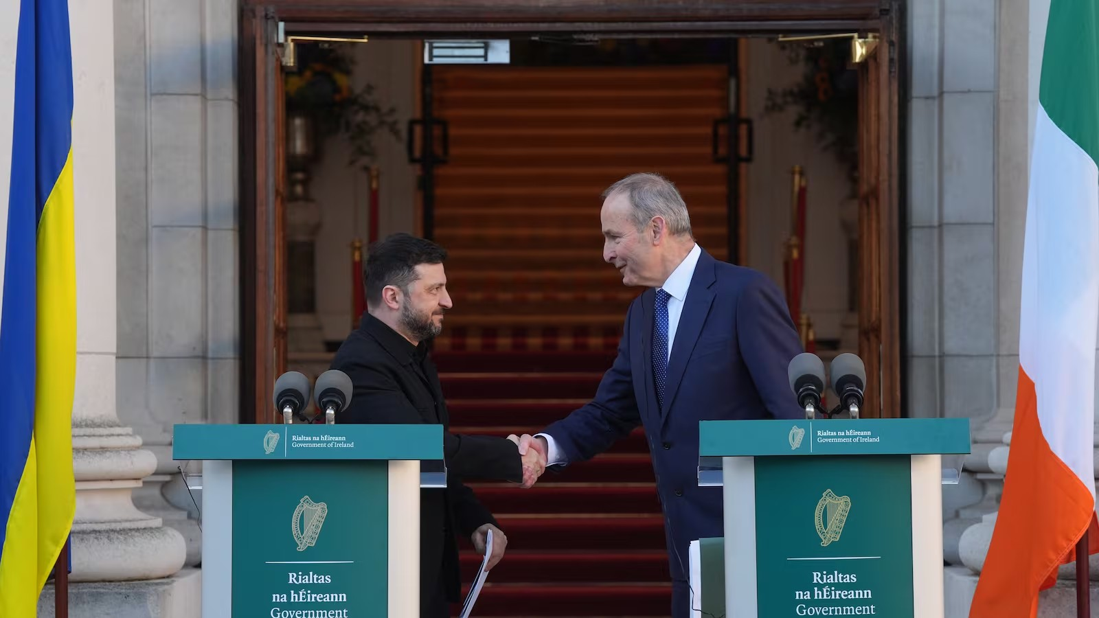 Volodymyr Zelensky was greeted by Ireland’s president in Dublin as the Irish Government announced 100 million euro in non-lethal aid for Ukraine.
