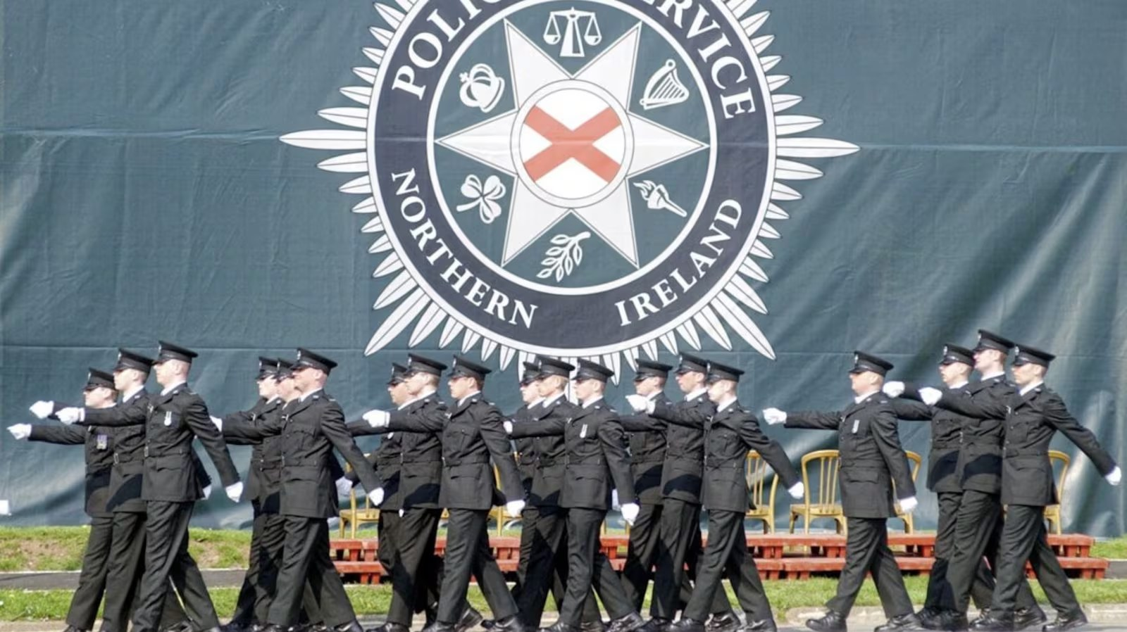 New recruits of the Police Service of Northern Ireland march past the new PSNI logo during the first ever graduation ceremony in Belfast.